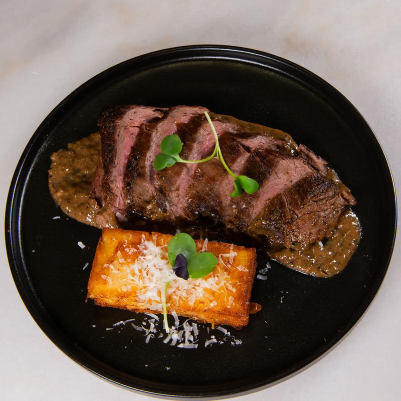 Cast-iron-seared beef filet topped with a rich peppercorn pan sauce, paired with crispy layered potatoes.