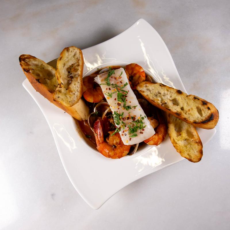 Manila clams, bay scallops, and tiger prawns layered in our house-made spicy Calabrian chili fish stock, topped with a butter-poached cod filet.