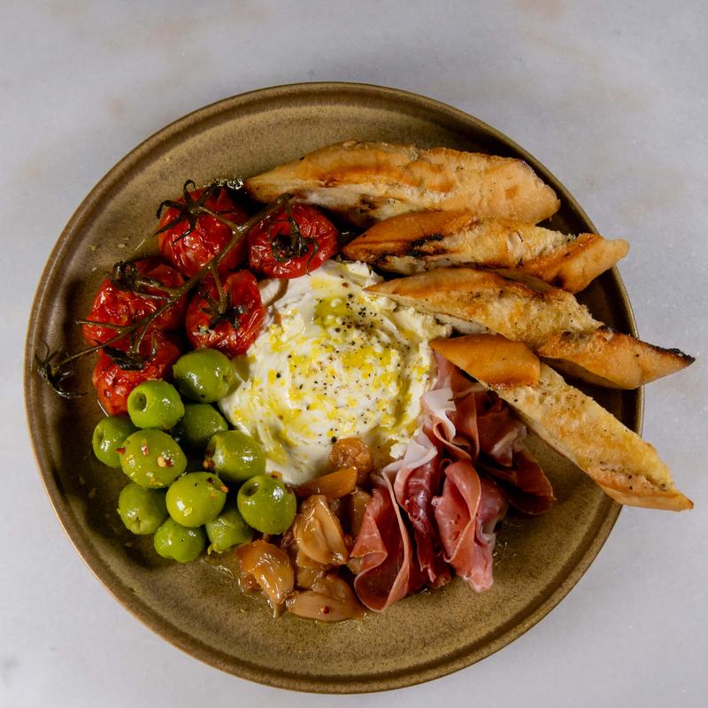 Whipped ricotta seasoned with citrus and garlic-infused olive oil, alongside marinated Castelvetrano olives, spreadable confits of garlic and vine-ripened tomatoes, prosciutto, and grilled baguettes.